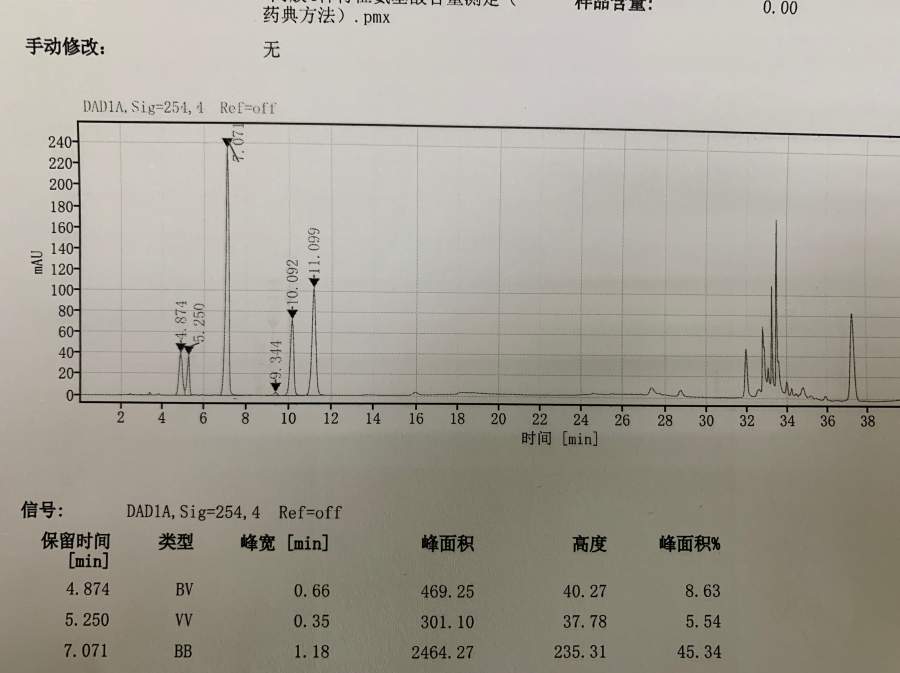 根据药典方法测定阿胶中4种氨基酸的含量,其中L-羟脯氨酸出了2个峰,峰高相同,样品和对照品都是这样,如下图。有没有大神可以帮忙解答一下是什么问题谢谢~![]() 0685082E38D1200503B5C236A5B97E2B.png |