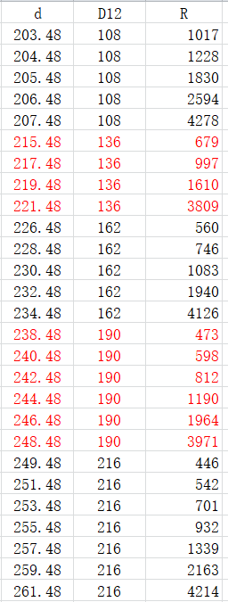 下面模型公式从效果上看应该还可以: R = 1/(exp(p1+p2/d^p4+p3*ln(p5*D12)))+p6+p7*D12; Root of Mean Square Error (RMSE): 82.7646978246006 Sum of Squared Residual: 184949.870561931 Correlation Coef. (R): 0.997839022184385 R-Square: 0.995682714193889 Adjusted R-Square: 0.995119589958309 Determination Coef. (DC): 0.995682714193889 Chi-Square: 54.1801936308235 F-Statistic: 768.756680906445 Parameter Best Estimate ---------- ------------- p1 92.0766213625132 p2 1465578.97866625 p4 1.85549150846 p3 37.0190126927207 p5 8.44980188956083E-5 p6 1084.86001080302 p7 -3.18715106817231 |