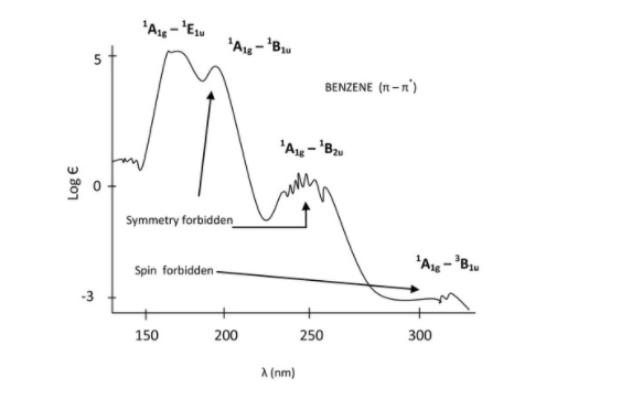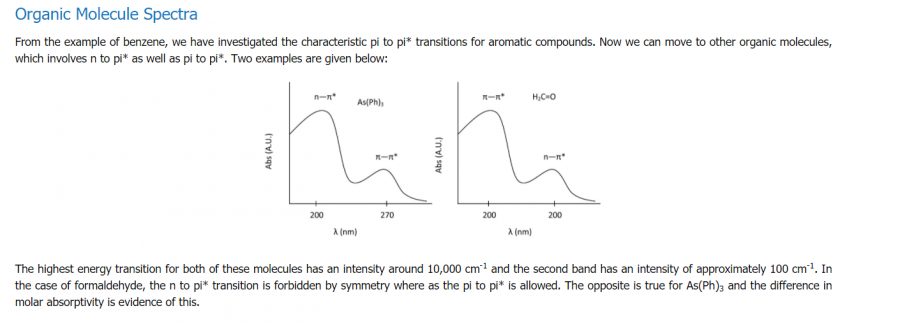 具体判断方法就可以直接查看基态分子轨道判断出HOMO LUMO附近的上下几个轨道分别属于什么类型的轨道 (一般可以通过分子轨道的形状或者也可以分析分子轨道的组成判断是n还是pi轨道)。然后可以查看激发态计算比如TDDFT计算中 给出的第一激发态的组态系数 判断出激发态是从哪个轨道到哪个轨道的跃迁主导的。(TDDFT输出文件会给出跃迁轨道的编号)通过编号查看分子轨道分别代表了什么轨道就可以确定具体是n-π* 还是 π-π*了 而另外一方面跃迁是有选律的。电子跃迁也不例外。具体来说 电子的跃迁选律有好几条。其中一条是 电子跃迁偶极矩的大小是跟参与跃迁的轨道的初态和末态的对称类有关系的。一般要求初态和末态还有跃迁偶极矩算符的直积全对称。并不是所有的π-π* 都是允许的也不是所有的n-π* 都是禁阻的 需要具体情况具体分析。不能一概而论的。但是原则总是不变的。见下图就是很好地例子。苯的π-π* 跃迁有的就是允许 有的就禁阻。而下面两个化合物正好是两种类型的跃迁有相反的强度。一切都是具体要看轨道的对称性来决定的。图片来源(https://chem.libretexts.org/Book ... y%3A_Interpretation) QQ截图20200820141925.png QQ截图20200820141855.png |