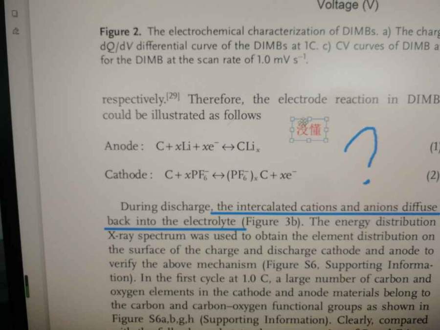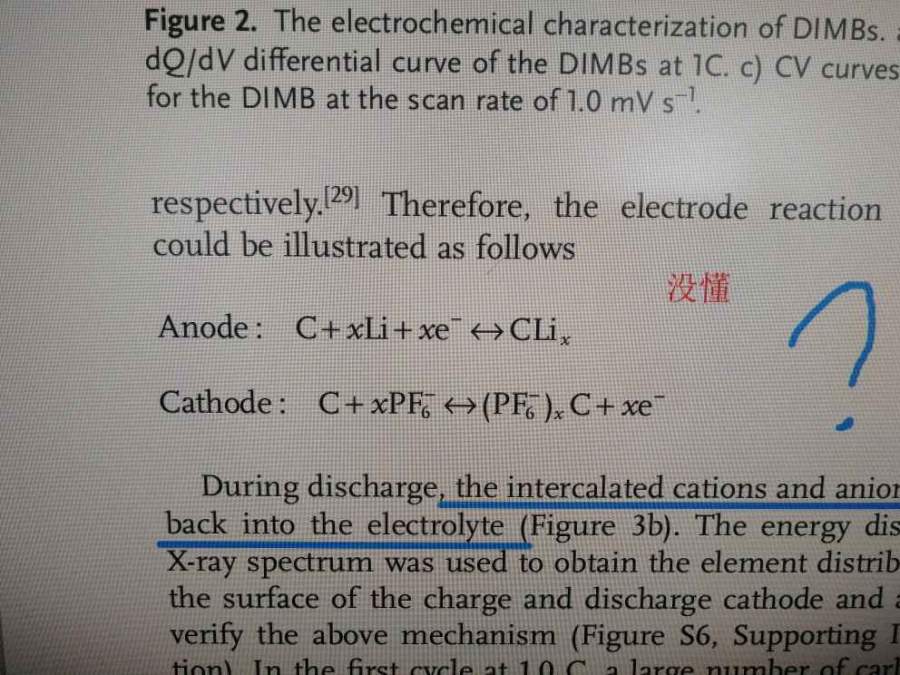 放电时,负极是阳极,发生氧化反应,给出电子的同时,阳离子回到电解液,正极是阴极,发生还原反应,吸收电子的同时,释放阴离子六氟磷酸根回到电解液里,没毛病。 发自小木虫Android客户端 |