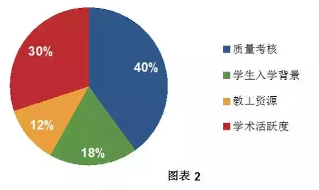 教工资源、学术活跃度、质量考核、学生入学背景,其中相应的占比,大家可以参考下图: