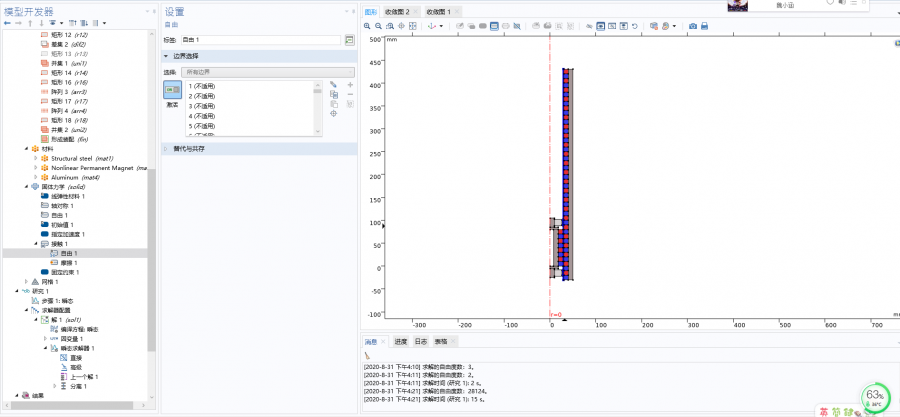 如图所示,我的是一个固体力学轴对称模型。计划让外围的固定,内部的移动,然后求接触对上的摩擦损耗。可是计算结果并没有发生运动。 我看“接触-自由”以及“接触-摩擦”那里所有边界都不适用,不知道是不是这个问题。 请教大佬们怎么解决。 1223.png |