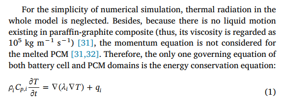 空气和复合相变材料的混合散热仿真,模型为热源与复合相变材料之间热传递,同时空气对热源和复合相变材料进行对流散热。根据下图论文的假设将复合相变材料的粘度设为100000kg/m/s,但仿真结果出现明显错误:热源的生热率和散热状态都是相同的,但是热源之间和复合相变材料块之间的温度出现很大差异,还出现复合相变材料块的温度高于热源的非正常情况。当把复合相变材料的粘度设为一个很小的数时,仿真结果恢复正常。请教各位仿真大佬们这个问题该如何处理?谢谢啦! 模型设置.png 动力粘度假设.png@wuming524 |
