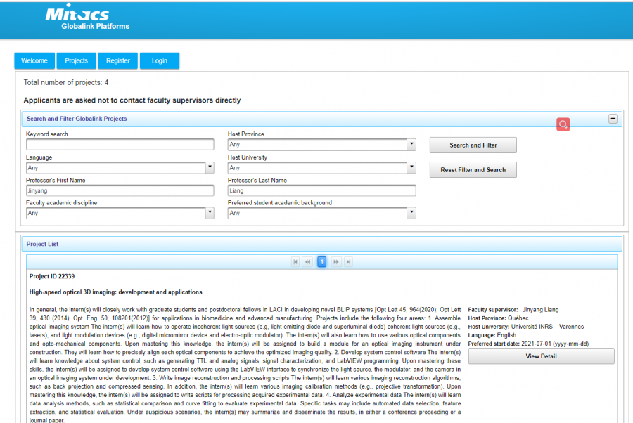 查询步骤见如下: 我们正在为Mitacs Globalink 2021招聘本科实习生。请按以下方式搜索本实验室的项目: 转到:Https://globalink.mitacs.ca/#/student/application/projects 在教授的名字和姓中键入“金阳”和“梁”。 点击“搜索和筛选” 我为总共4名实习生发布了两个项目。截止日期为9月23日。 QQ图片20200908101247.png |