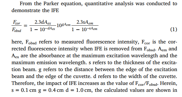 各位荧光高手,请教一个关于荧光强度校正的问题,就是对于荧光测试时,常会用到如下的公式对观测到的荧光强度进行校正,但是我对这方面的公式存在以下几个问题。 如下面的公式,Fcor校正的荧光强度是不是通过这个公式计算? 表1中的Eobsd和Ecor表示的是抑制效率,那么它俩分别怎么计算? QQ图片20200912161308.png QQ图片20200912161714.png |