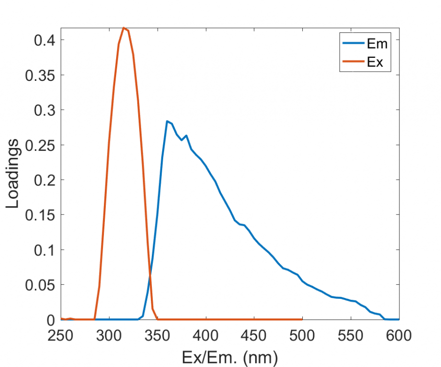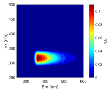 小弟求助,这是经过平行因子方法分析出来的一个组分,EX=315,EM=360,这是一个什么成分呢,查了好久没找到,谢谢各位大佬了。