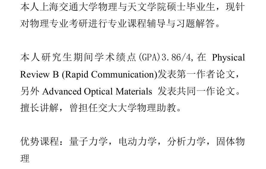 本人硕士毕业之后等待出国期间希望可以靠自己的所学赚一点生活费。可以从考研试题讲解、论文建议、课程辅导等方面提供帮助。下面是我的简介。不得不说,学生党真难啊。 发自小木虫Android客户端 |