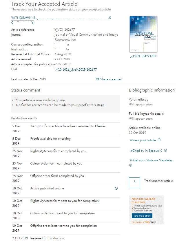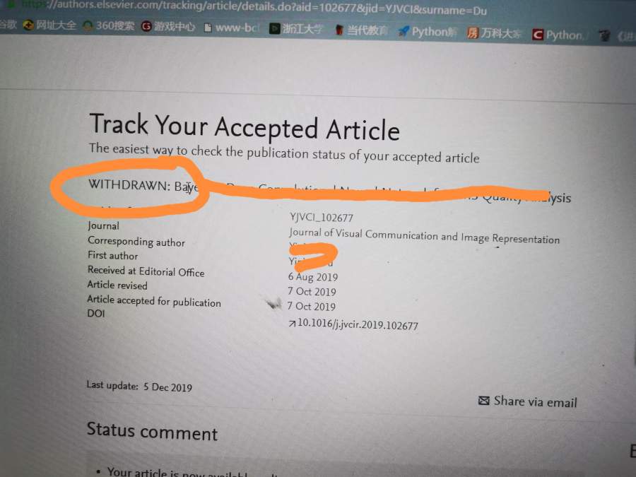 第一次投稿,已经on line很长时间,以前没注意,今天打开论文状态的跟踪链接,发现题目前面有个withdrawn。请问大神这是被撤稿了吗?可是没有收到撤稿邮件,投稿系统状态还是已接受,期刊网站文章也在,就是一直是In Press, Journal Pre-proof。求教各位,有没有遇到这种情况?是不是被撤了?多谢! 1.jpg |