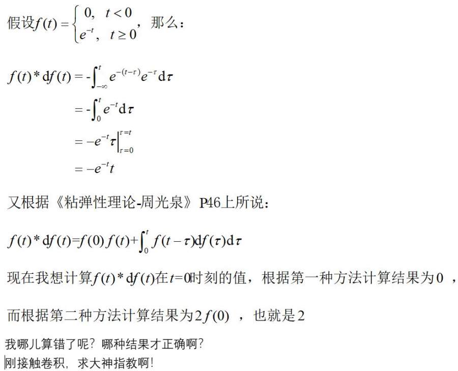 我想求衰减函数的stieltjes卷积在零时刻的值是多少,用了两种方法求出来的结果完全不同,我哪儿出错了啊?哪个是正确的啊?求大神指教