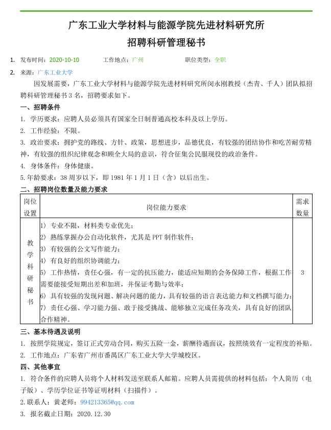 科研秘书招聘