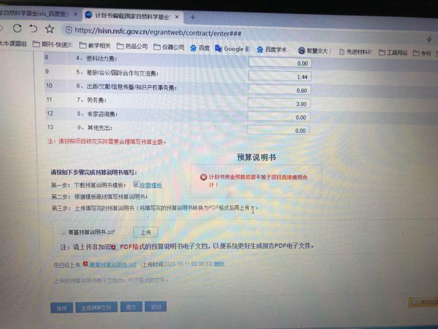 在填写青基计划书时需要重新提交资金预算表,本人一时疏忽,导致资预算说明书与资金预算表有出入,昨天收到邮件被退回,要求修改。但是,重新上传资金预算说明书时,保存后,提交时系统提示“计划书资金预算总额不等于项目直接费用合计!”而导致不能提交,是什么意思啊?有没有大佬知道啊,急急急!可是我项目直接费用是24万与获批的一致呀。为什么提交不了?今天不是工作日叶不能咨询资金委,10.14就截止了,急啊! 发自小木虫IOS客户端 |