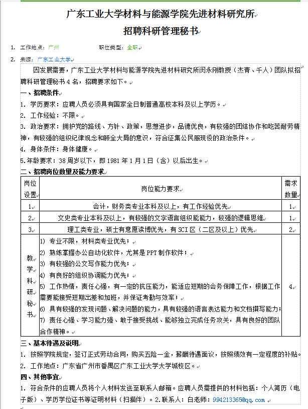 广东工业大学材料与能源学院先进材料研究所(千人,杰青) 招聘科研管理秘书(本科及以上,会计,财务,文史类,理工类) 1.?工作地点:广州 ?????????????职位类型:全职 2.?来源:广东工业大学 因发展需要,广东工业大学材料与能源学院先进材料研究所闵永刚教授(杰青、千人)团队拟招聘科研管理秘书4名,招聘要求如下。一、招聘条件1. 学历要求:应聘人员必须具有国家全日制普通高校本科及以上学历。2. 工作经验:不限。3. 政治要求:拥护党的路线、方针、政策,思想进步,品德优良,有较强的团结协作和吃苦耐劳精神,有较强的组织纪律观念和顾全大局的意识,符合征集公民服现役的政治条件。4. 身体条件:身体健康。5.年龄要求:38周岁以下,即1981年1月1日(含)以后出生。二、招聘岗位数量及能力要求岗位设置 岗位能力要求 需求数量 1 会计,财务类专业本科及以上,有工作经验优先 1 人 2 文史类专业本科及以上,有较强的文字语言组织能能力,较强的逻辑思维 1 人 3 理工类专业,硕士有意愿读博优先,有SCI区(二区及以上)优先 2人 教学科研秘书 1) 专业不限,材料类专业优先;2) 熟练掌握办公自动化软件,尤其是PPT制作软件;3) 有较强的公文写作能力优先;4) 有良好的组织协调能力优先;5) 工作热情,责任心强,有一定的抗压能力,能适应短期的会务保障工作,根据工作需要能接受短期出差和加班,并保证考勤与效率;6) 具有较强的发现问题、解决问题的能力,具有较强的语言表达能力和文档撰写能力;7) 责任心强、学习能力强、敢于接受挑战、能够独立完成任务攻关,具有良好的团队合作精神。 4 三、基本待遇及说明 1. 按照学院规定,签订正式劳动合同,购买五险一金,薪酬待遇面议,按照绩效有一定程度的补贴。 2. 工作地点:广东省广州市番禺区广东工业大学大学城校区。 四、其他事宜 1. 符合条件的应聘人员将个人材料发送至联系人邮箱。应聘人员需提供的材料包括:个人简历(电子版)、学历学位证书等证明材料(扫描件)。2.联系人:白老师:994213365@qq.com? 发自小木虫Android客户端 |