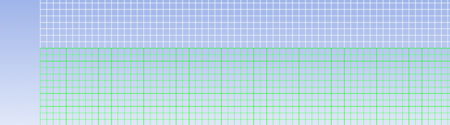 区域如图所示,白色部分是固体,下面是气体。其实想模拟的是固体受热后发生燃烧。思路是取与固体接触的那一层气体单元,判断那一侧气体单元,如果单元内的温度、压力以及与它接触的固体单元内的温度达到一定值后就从这层气体单元内加质量源项和能量源项等。源项的代码(示意代码)如下: