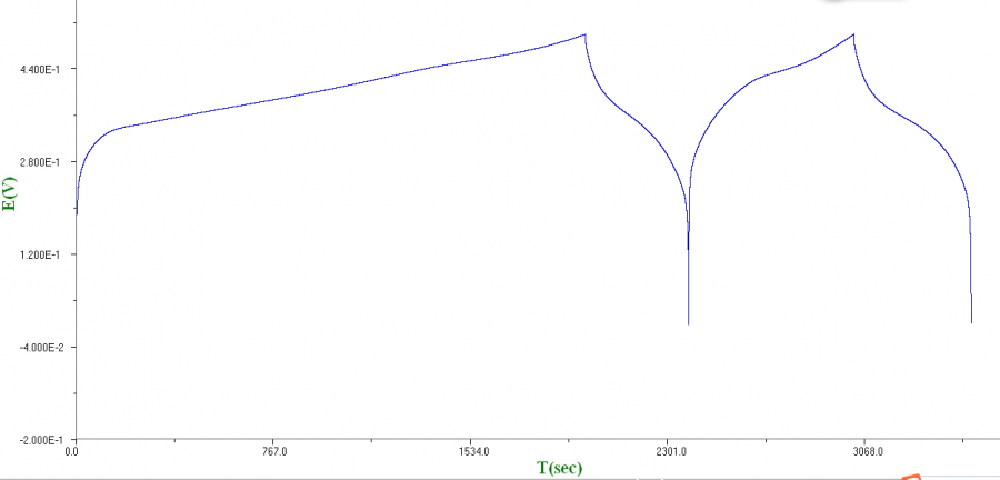 做的赝电容材料,我的测试是先跑50圈50mV/s的CV,然后来测充放电。第一圈的充电时间远远大于放电时间,第二圈图形感觉是符合的,但实际上放电只有充电的60%左右。测试了好几个电极都是这样。求教各位前辈,这种情况是电解液没有完全接触材料吗?还是材料有杂质,或者说这个材料就不行。(参比:汞氧化汞,电解液:1M KOH,区间0-0.5V) GCD.png |