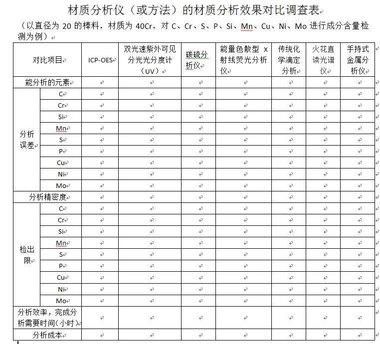 我司准备实施金属材料的化学成分分析,但还未确定方案,为此我想调查一下几种材质分析仪(或方法)各自分析效果,各种分析仪器(或方法)的对比项目如下(可下载附件查看)。(以直径为20的棒料,材质为40Cr,对C、Cr、S、P、Si、Mn、Cu、Ni、Mo进行成分含量检测为例) 材质分析仪(或方法)的材质分析效果对比调查表.JPG |