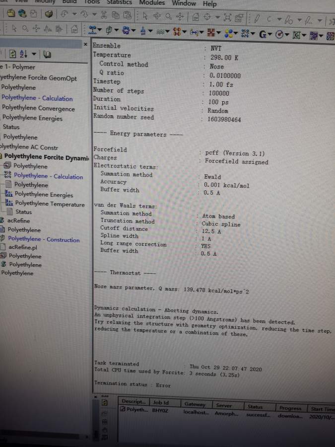 | MS软件Forcite模块做分子动力学计算,报错“The job has failed. Download any results generated so far”。大神指教这是什么原因? |