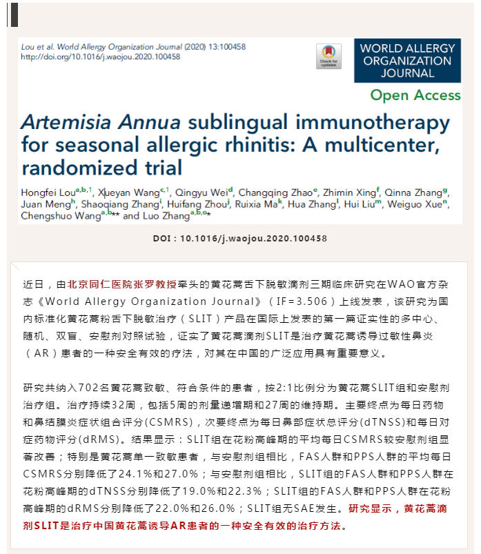 黄花蒿舌下免疫治疗用于季节性变应性鼻炎:一项多中心、随机试验