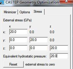 请教高手 ,我想用castep 进行结构优化,并模拟高压下体系的性质,是这样施加压力吗 (图2 所示)?? 我想模拟 20 Gpa 时的性质,是在对角线位置输入 20 吗 ?? QQ截图20201111142807.jpg QQ截图20201111142955.jpg |