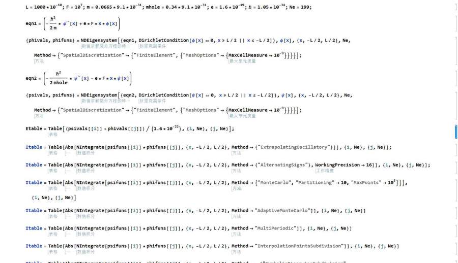 L = 1000*10^-10; F = 10^7; m = 0.0665*9.1*10^-31; mhole = 0.34*9.1*10^-31; e = 1.6*10^-19; \[HBar] = 1.05*10^-34; Ne = 199;eqn1 = (-(\[HBar]^2/(2 m))* (\[Phi]^\[Prime]\[Prime])[x] + e*F*x*\[Phi][x]);{phivals, phifuns} = NDEigensystem[{eqn1, DirichletCondition[\[Phi][x] == 0, x \[GreaterSlantEqual] L/2 || x <= -L/2]}, \[Phi][x], {x, -L/2, L/2}, Ne, Method -> {"SpatialDiscretization" -> {"FiniteElement", \ {"MeshOptions" -> {MaxCellMeasure -> 10^-9}}}}];eqn2 = (-(\[HBar]^2/(2 mhole))* (\[Psi]^\[Prime]\[Prime])[x] - e*F*x*\[Psi][x]);{psivals, psifuns} = NDEigensystem[{eqn2, DirichletCondition[[Psi][x] == 0, x [GreaterSlantEqual] L/2 || x <= -L/2]}, [Psi][x], {x, -L/2, L/2}, Ne, Method -> {"SpatialDiscretization" -> {"FiniteElement", \ {"MeshOptions" -> {MaxCellMeasure -> 10^-9}}}}];Etable = Table[(psivals + phivals[[j]])/(1.6*10^-22), {i, Ne}, {j, Ne}];Itable = Table[ Abs[NIntegrate[psifuns[]*phifuns[[j]], {x, -L/2, L/2}, Method -> {"ExtrapolatingOscillatory"}]], {i, Ne}, {j, Ne}]; |
