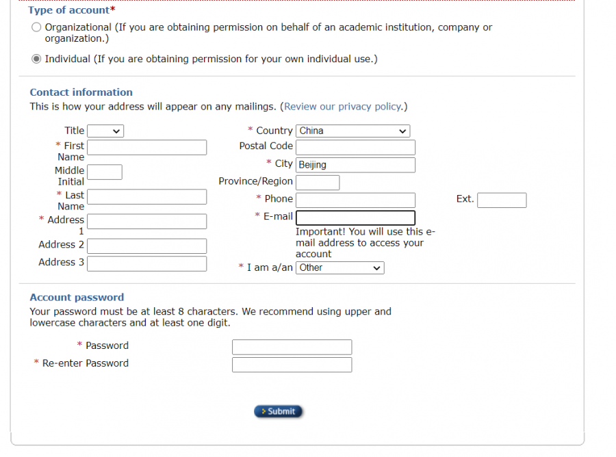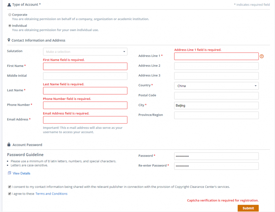 目前综述已被接受,但编辑提出要获得版权才可以,在网上查询资料之后发现可以在这个网站(https://www.copyright.com/displayOrgRegistration.action)上面注册账号申请版权即可,但是本菜菜在注册时卡在这一步,显示需要验证码或者是验证码不通过,但是页面根本没有发送验证码以及填写验证码的地方,晕死。。。有木有大佬提示一下呀,感谢感谢!!! 1.png 2.png 3.png |