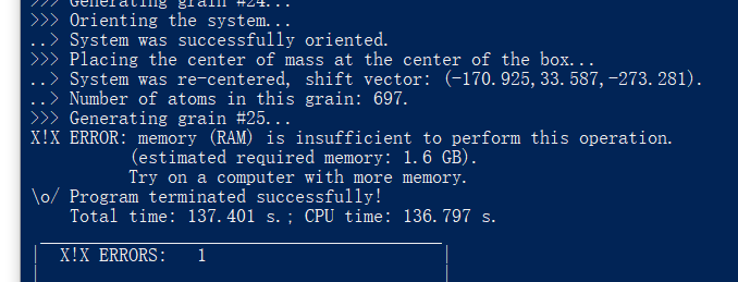 分子模拟小白,最近在尝试做梯度多晶的模型,使用Atomsk建模 只能做出最小晶粒1nm尺寸的模型,加大模型就报错,如图: 电脑win10,有16g的物理内存,虚拟内存也够用 尝试按照网上的教程修改过powershell的memory,结果没有用 教程链接如下:https://devblogs.microsoft.com/s ... -powershell-memory/ 也尝试了各种办法对付关于“电脑内存不足”的问题,但是都没有用 请问大家有没有什么好的办法解决这个问题 或者、这个问题是什么原因?是不是Atomsk软件本身的问题? 提前谢谢大家了 ![]() d6ce08b7c3746f6ab9a63dacd3de7b3.png |