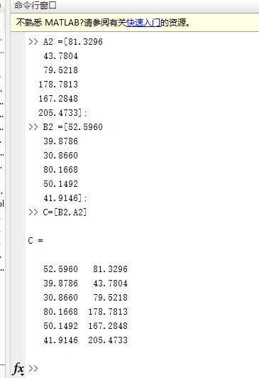 请高手指教,如何将两列数据保存至一个矩阵中 如:A2 B2每列6行数字 A2 = 81.3296 43.7804 79.5218 178.7813 167.2848 205.4733 B2 = 52.5960 39.8786 30.8660 80.1668 50.1492 41.9146 我想生成一个6行2列的矩阵,A2在左边,B2再右边如何生成? C=[A;B]? |