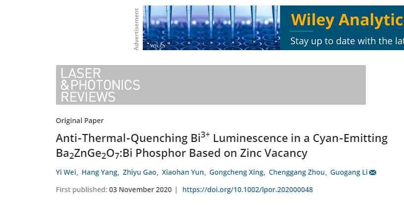 Anti‐Thermal‐Quenching Bi3+ Luminescence in a Cyan‐Emitting Ba2ZnGe2O7:Bi Phosphor Based on Zinc Vacancy