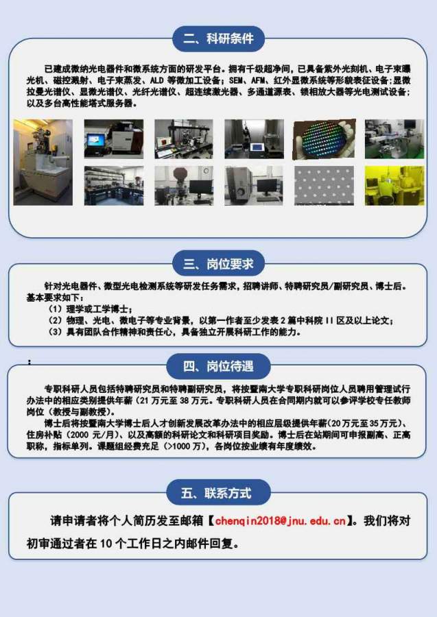 2021年暨南大学纳米光子学研究院光电器件陈沁教授研究团队诚招专职科研人员和博士后,具体细则如下面图片所示,欢迎咨询。 [ 来自版块群 广东 ] |