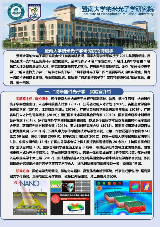 2021年暨南大学纳米光子学研究院光电器件陈沁教授研究团队诚招专职科研人员和博士后