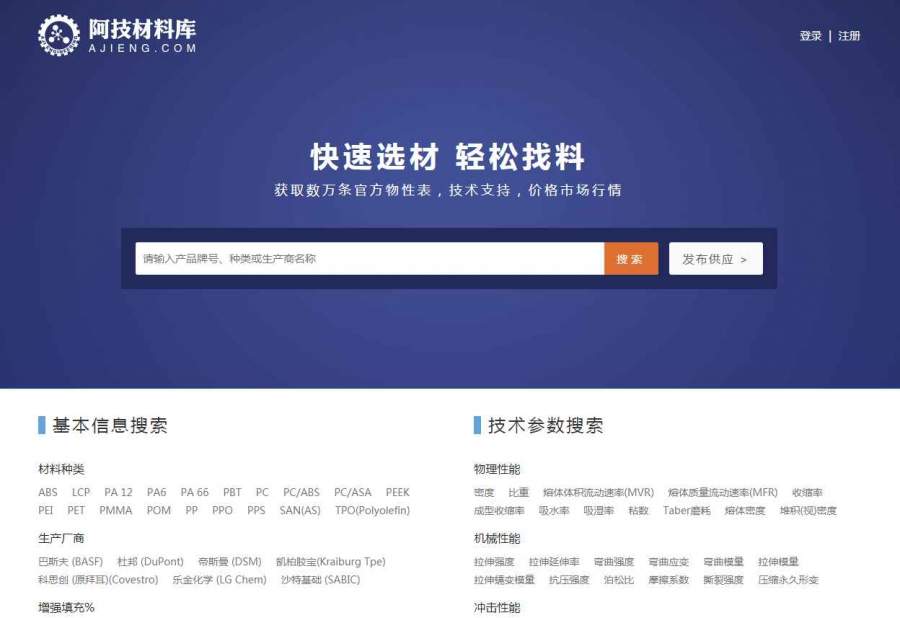 基于材料性能搜索的工具。搜索功能强大。 基本信息搜索 1.种类 2.产生厂商 3.增强填充% 4.产品特性 5.法规认证 技术参数搜索 1.物理性能- 密度,比重,MFR,MVR,收缩率,吸水率。 2机械性能-拉伸强度,拉伸模量,弯曲强度,弯曲模量等 3.冲击性能-简支梁缺口(Charpy Notched),简支梁无缺口(Charpy Unnotched),悬臂梁缺口(Izod Notched),悬臂梁无缺口(Izod Unnotched) 4.热学性能-热变形温度(HDT),维卡软化温度(Vicat),相对温度指数(RTI),比热容线性膨胀系数(CLTE),熔融温度(Tm),导热系数,球压痕温度 5.阻燃防火性能- UL 防火等级,氧指数(LOI),灼热丝可燃性指数(GWFI),灼热丝点燃温度(GWIT) 6.电学性能-体积电阻率,表面电阻,率耗散因数(DF),相比漏电起痕指数 ( CTI ),绝缘强度,耐电弧性高电压电弧起痕速率(HVTR) 7.硬度性能-巴氏硬度,洛氏硬度L,洛式硬度M,洛氏硬度R,邵氏硬度A,邵氏硬度D,球压硬度 8.光学性能-透光率,雾度,折射率,反射率,光泽度,光密度(OD),阿贝数 以上都叠加条件筛选搜索。 阿技材料库(www.ajieng.com)收录主流厂商材料,搭建快速选材平台,提高选材效率。 发自小木虫Android客户端 |