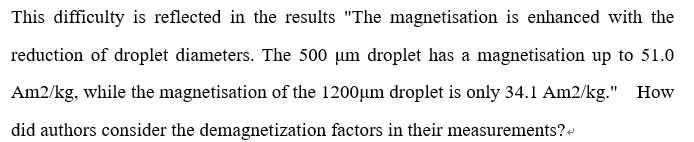 具体是这样的: 本来想通过M-T曲线对比不同直径的球的磁化强度大小,得出直径越小单位质量磁化强度M越高的结论。但是审稿人问是否考虑退磁因子的影响,科研小白当时完全没有考虑啊啊啊…… 现在想想办法圆过去,目前搜到的结果是退磁因子只跟样品形状有关,球体都为N=1/3。但是退磁场为Hd=-NM,这样的话怎么计算不同直径小球的实际磁化强度呢?或者有没有可能证明这个退磁因子和退磁场对不同直径小球的磁化强度影响不大呢? 发自小木虫Android客户端 |