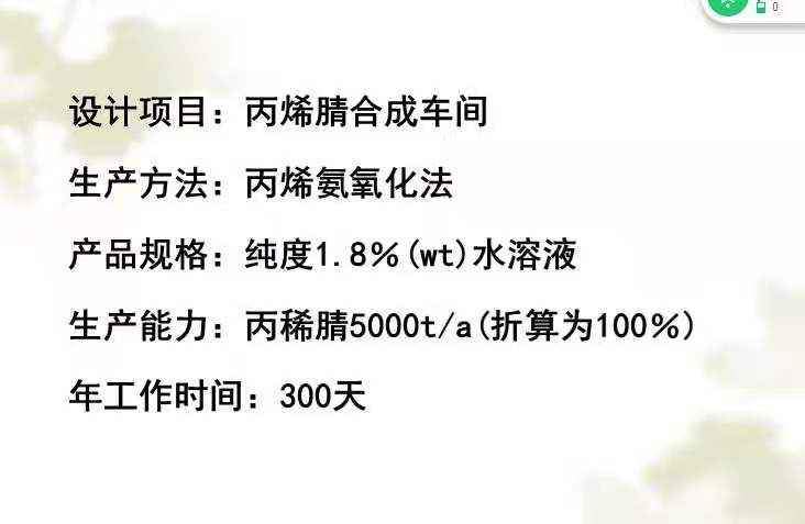设计项目:丙烯腈合成车间 生产方法:丙烯氨氧化法 产品规格:纯度1.8%(wt)水溶液 生产能力:丙烯腈5000t/a(折算为100%) 年工作时间:300天 @xiaofan700 @caominone 发自小木虫Android客户端 |