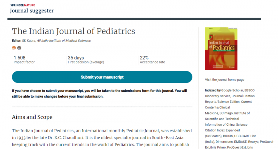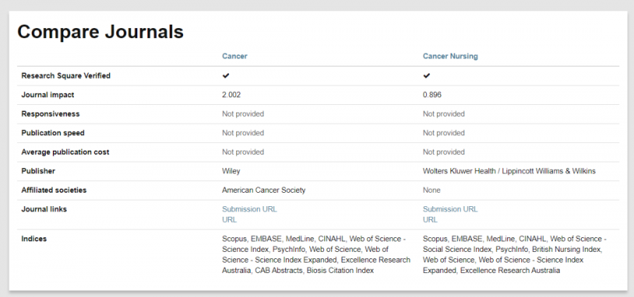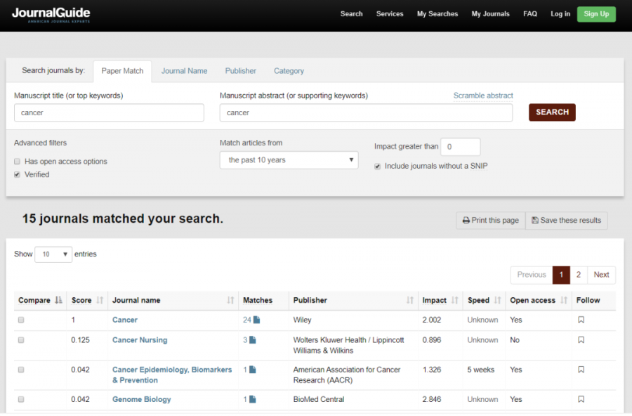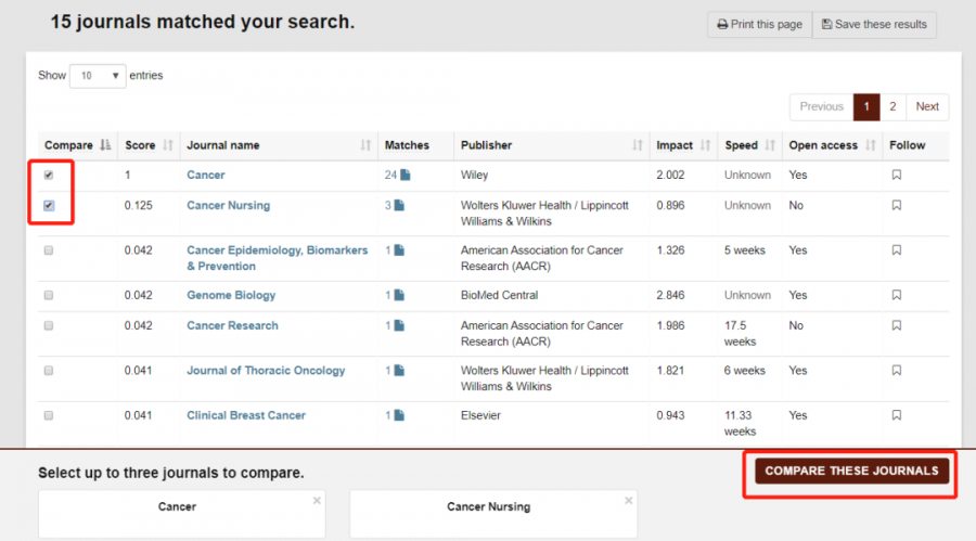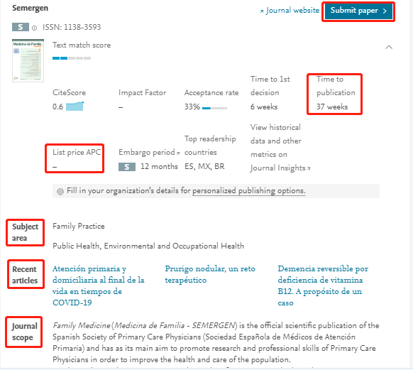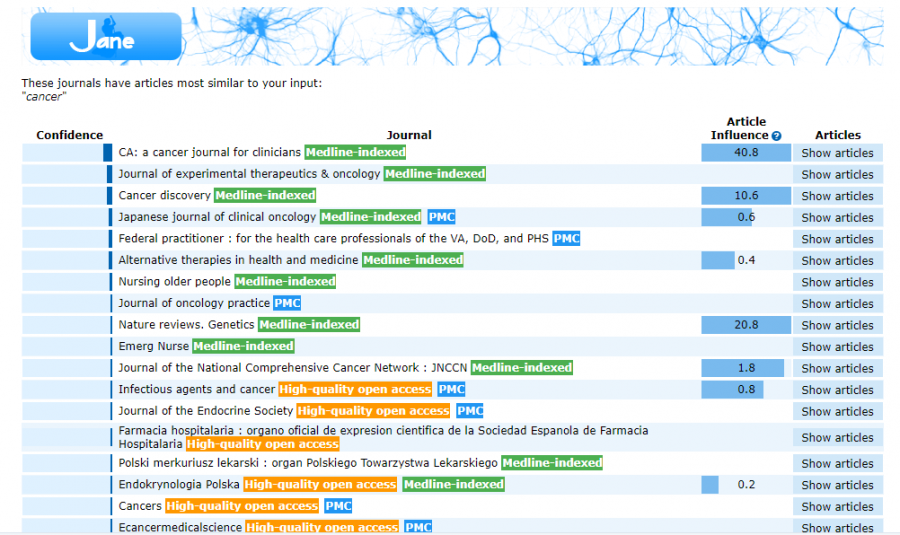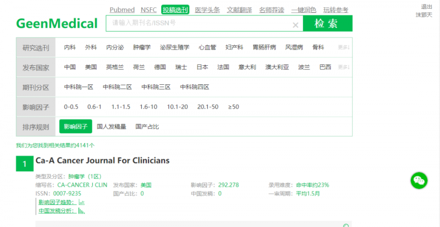 无论是对于急需毕业的小伙伴还是需要评职称的科研战友来说,发论文都是必不可少的。论文写作堪比西天取经,当我们经历“九九八十一难,取得真经“后,还有最关键的一步,那就是选刊发表。这就让不少朋友犯起难来,我们要选择最合适自己投稿的期刊,不要让你的选择高不成低不就! 今天就为大家介绍几个能够协助各位投稿的神器,找到最适合你这篇文章的期刊,少走冤枉路,获得最大回报! 1 Journal/Author Name Estimator JANE由荷兰的公司开发,应用非常广泛,使用界面也非常简单。各位小伙伴在输入框里面直接输入关键字、文章标题和摘要等内容就可以进行搜索。 JANE这款选刊工具的优点是简单易上手,而且提供选择期刊的范围也很广泛,不足就是提供的期刊详细信息不够丰富,小伙伴们在选到心仪期刊后可能还需要通过其他工具进一步查找投稿经验等详细信息。 JANE的网址大家可要记好了:https://biosemantics.org/jane/ 大家可以在Show extra options里面设置更多的搜索选项,包括出版语言(Language)、是否偏向OA期刊(Open Access)、文章类型(Publication Types,如临床试验和病例报告)、以及语言是否限定Pubmed Central。 如上面的Publication Types所示,展示出的也更多是生物医学的类型,看出JANE更适合生物学和医学专业领域。 当我们点击Find journals(其他两个选项Find authors和Find articles,大家可以进一步尝试),就会得到系统自动匹配的一些期刊推荐。结果如下图所示:最左边是匹配程度;中间是期刊名称以及对期刊的标注,比如绿色表示是Medline期刊,蓝色表示被PMC收录,橙色表示高质量OA期刊等;右边的article influence是根据过去5年引用量来评价杂志影响力的一个指标,注意并不是影响因子;最右边是匹配到的相似文献,点击即可打开一个文章列表,每一条文献都直接链接到pubmed。 2 Springer Journal Suggester Springer Journal Suggester是由SCI出版界的巨头之一Springer出版社开发,可以搜索所有Springer和BioMed Central的刊物。 同样,我们输入文章题目、摘要,选择研究领域,就会推荐多个相关期刊供你选择。显示期刊的各种计量指标也会显示出来,如:录用率、一审周期、是不是OA期刊等。 Springer Journal Suggester的官方网址大家要收藏好了: https://journalsuggester.springer.com/ 首先,我们进入Journal Suggester主界面,然后输入标题,摘要等内容,即可进行搜索。Springer Journal Suggester可以根据我们输入的摘要和标题,搜索到一系列的期刊,同时也显示了各个期刊的影响影子,投稿周期,以及投稿中稿率,极大的方便了小伙伴们进行查找。 点击右侧的期刊封面图片图片,我们就能进入到该期刊的投稿界面,对比多个同类期刊,我们可以选择性价比最高的,提交你的心爱的文章了! 3 Journal Finder Journal Finder是由SCI出版界的另一巨头Elsevier开发的智能选刊工具。当然,和前面一样,我们只要输入论文的标题、摘要,选择合适的学科,它就会自动的将文章与Elsevier旗下期刊进行匹配,助力你快速找到最适合发表Paper的期刊。 它的网址就是: https://journalfinder.elsevier.com/ 按照提示,我们输入题目(Paper title)、摘要(Paper abstract)、研究方向(Fields of research)等信息,最后点击“Find Journal”选项,就能得到相关期刊的信息了。如下如图所示: 经过上一步,我们可得到如下结果,如下图所示: 推荐期刊的名称、影响因子、引用分(CiteScore)、文章接收率、审稿速度、出版周期、能否选择开放源。 另外, 我们还可以通过选择不同排序方式(Sort by Match)来获得最适合我们投稿的期刊。对于想冲一下高分期刊的小伙伴可以选择按影响因子由高到低排序;而急于毕业、晋升需求急用的朋友们就可以选择按照审稿速度以及录用率来排序。 在筛选出你满意的期刊后,可以进一步查看出版周期、开源出版费用、以及杂志出版范围等详细信息。最后点击“Submit Paper”就可以直接进入期刊的官网提交你的文章。如下图所示: 值得我们注意的是,Journal Finder只推荐Elsevier集团旗下的期刊,其展示的审稿周期、录用率、见刊周期的统计数据也仅对于Elsevier旗下的杂志。 4 JournalGuide JournalGuide是一款覆盖了超过4.6万种SCI期刊的目标期刊选择必备工具,它能针对您的论文,迅速筛选出内容最匹配的期刊,帮您准确做出最优的投稿选择。其检索结果,包括期刊的名称、影响因子、出版社,以及期刊与本论文内容的相关程度。相关程度越高,期刊得分越高,排序越靠前。同时,针对每个匹配期刊,JournalGuide都会给出该期刊上与之相似度高的文献,方便大家在投该期刊的时候引用。对于JournalGuide,我们只需要输入论文的标题和摘要,点击“SEARCH”,即可检索出与我们论文内容相匹配的SCI期刊。 它的网站可别忘记了:https://www.journalguide.com/ 在主页的右上角,我们可以注册,当然不注册我们也是可以用的,只是无法使用保存功能。其包括4种搜索期刊的方法,分别为:按文章、期刊名、出版商,以及类别搜索。搜索部分包含了高级搜索和匹配区域两大块。例如,我们以cancer(癌症)为例,得到结果如下图所示: 当然,我们可以选择几个感兴趣的期刊进行比较,如下图所示: 经过上一步,我们得到如下结果,将期刊的信息完整的展现在我们眼前。 5 GeenMedical GeenMedical ,想必有些小伙伴已经很熟悉了。小沫自己平时也经常用它。GeenMedical是一款整合了Pubmed、SCI-HUB、百度学术以及RearchGate等资源的本地化平台。它不仅可以检索文献,还可以直接打