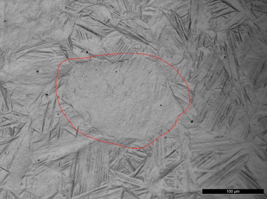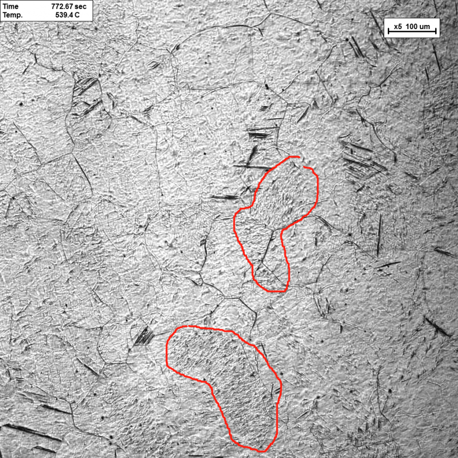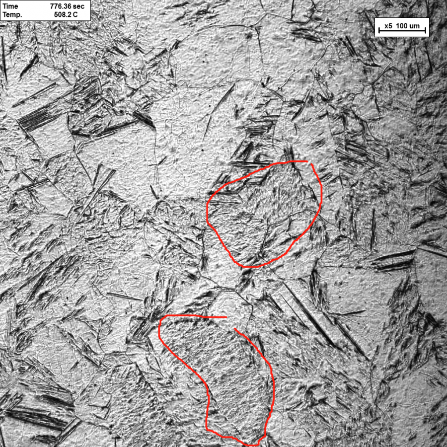想请教一下各位专家同行,图片是低碳贝氏体钢(成分:0.09C-0.12Si-1Mn-0.0092Ti-0.0014B-0.4Cr-0.38Mo-0.036V-0.004Al-0.0042Mg-0.0007O)在高温共聚焦连续冷却过程的出现的成片成片的组织以及最后结束时的金相照片,想问下图中红色范围内的是什么组织?是贝氏体吗? 谢谢! 1.png 2.png 3.png 4.png |