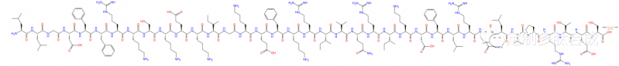 天然免疫系统是机体抵抗微生物感染的一道功能性和生理性屏障,而抗菌肽是天然免疫系统重要的效应分子。目前,已发现的抗菌肽约1500种。这类抗菌肽广泛的应用于 癌细胞、革兰氏阴性及阳性细菌、真菌、病毒、原虫等等方面。 人体内主要产生两大类抗菌肽:defensin家族肽和cathelicidin家族肽。虽然defensin家族肽有很多个成员,但cathelicidin只有1种抗菌肽产物LL-37。LL-37是cathelicidin肽Hcap-18的C末端切割产物,能直接杀死细菌、真菌和病毒。 在对LL-37的研究过程中,科研人员对其序列进行了很多的改造,例如Cys-LL-37、LL-37-Cys、LL-37-NH2、LL-37 Citrulline、Biotin-LL-37、Fam-LL-37以及LL-37的各种片段。 今天主要介绍一下LL-37本身的一些基本参数。 LL-37 CAS号:154947-66-7 单字母:LLGDFFRKSKEKIGKEFKRIVQRIKDFLRNLVPRTES 三字母:Leu-Leu-Gly-Asp-Phe-Phe-Arg-Lys-Ser-Lys-Glu-Lys-Ile-Gly-Lys-Glu-Phe-Lys-Arg-Ile-Val-Gln-Arg-Ile-Lys-Asp-Phe-Leu-Arg-Asn-Leu-Val-Pro-Arg-Thr-Glu-Ser 氨基酸个数:37 分子式:C205H340N60O53 平均分子量:4493.2633 精确分子量:4490.57517 等电点(PI):11.4 pH=7.0时的净电荷数:5.97 平均亲水性:0.68 结构图: 抗菌肽LL-37结构图 参考文献: 1、https://www.ncbi.nlm.nih.gov/ent ... ;list_uids=23246832 2、https://www.ncbi.nlm.nih.gov/ent ... ;list_uids=15609314 3、https://www.ncbi.nlm.nih.gov/ent ... ;list_uids=15964896 4、https://www.ncbi.nlm.nih.gov/ent ... ;list_uids=12782669 5、https://www.ncbi.nlm.nih.gov/ent ... ;list_uids=10417311 6、https://www.ncbi.nlm.nih.gov/ent ... ;list_uids=26502164 7、https://www.ncbi.nlm.nih.gov/ent ... ;list_uids=20308375 9、https://www.ncbi.nlm.nih.gov/ent ... ;list_uids=19728885 10、https://www.ncbi.nlm.nih.gov/pubmed/16716248 11、https://www.ncbi.nlm.nih.gov/pubmed/16723446 e3625b7d13aacca9dccc9a9d958f25c8_3c4fc58c296f68e1.png |