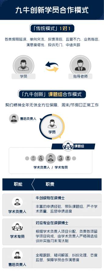 九牛问津,由4位牛津剑桥大学博士组建,公司成员覆盖至全世界范围知名高校硕博士团体。我们以“高质量、正三观、做清流”为核心理念,致力于教育、留学、科技研发领域,包括:硕博留学申请、在线1对1教育咨询、人工智能研发等,旨在净化留学环境、革新教育产业、助力科研发展。2020年,我们将继续砥砺前行,不忘初心。 一、服务范围 2020年,九牛问津-名校硕博留学申请业务已拓展至全球各英语国家硕士、博士申请。(点击下方文字了解详情) (1)留学文书写作及修改; (2)学术文书写作及修改(rp/ws/ww); (3)选校选专业定位; (4)科学教授套磁; (5)定制化名额制申请全程指导; (6)更多留学服务项目(面试、网申、雅思托福等); 二、学术实力 在九牛,我们没有所谓的“指导名师”、“教学总监”、“资深顾问”,只有靠专业能力说话的各位学长学姐。团队给大家处理留学申请的小伙伴目前100%由英国g5、港三大、北美藤校等世界级名校硕博士组成,由英国牛津总部综合管理。截至2020年,海外留学团队已扩招至160余名,其中硕士100余名,博士60余名,基本覆盖全学科全专业。(点击下方文字了解详情) (1)英国及欧洲大陆硕士博士成员; (2)亚洲地区硕士博士成员; (3)美国及加拿大硕士博士成员; (4)澳洲及新西兰硕士博士成员; 三、合作模式 四、实力保障 五、发展历程 六、立马咨询 [ last edited by freedomzzr on 2021-3-12 at 10:25 ] [ Last edited by freedomzzr on 2021-3-12 at 10:27 ] |