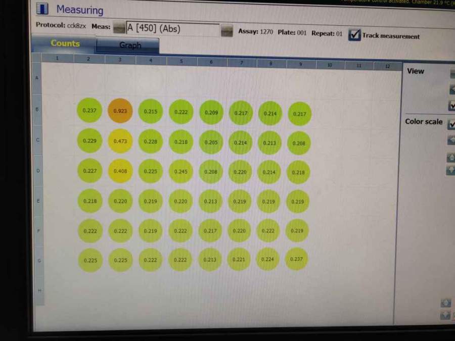 我的细胞毒性实验做了两次。细胞数量在7000-100000cell/100微升。 具体操作是:细胞预培养24h;然后加入不同浓度的药,孵育24h;用pbs冲洗两遍,换成新的培养基,加入cck-8 10微升,孵育3h。但是所有浓度剃度的吸光度都很低只有0.2左右(除了细胞加培养基+cck-8))。我的材料是生物相容性水凝胶。有没有大神给点意见,已经操作第四次了,还是不行。第二列是细胞+培养基+cck-8 发自小木虫Android客户端 |