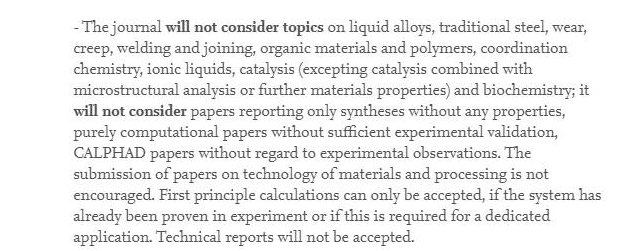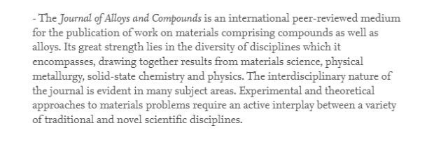 今天我们来分析一下在材料领域知名度非常高的期刊: Journal of Alloys and Compounds 。 期刊信息 瑞士工程技术-材料科学期刊Journal of Alloys and Compounds (ISSN:0925-8388),创刊于1991年,由著名出版社Elsevier出版,主编是德累斯顿工业大学材料科学研究所的Ludwig Schultz教授。 期刊网站: https://www.journals.elsevier.co ... loys-and-compounds/ 投稿网址: https://www.editorialmanager.com/jalcom/default.aspx JCR分区 中科院分区 刊载范围 该期刊主要发表有关化合物和合金材料的研究,包括对合成和结构的研究,以及对合金和化合物的化学和物理性质的研究。该期刊的优势在于它涵盖学科的多样性,包括材料科学、物理冶金、固态化学和物理学等。 该期刊将不考虑 有关液态合金,传统钢,磨损,蠕变,焊接和连接,有机材料和聚合物,配位化学,离子液体,催化作用(催化作用与微观结构分析或其他材料特性相结合的除外)和生物化学的主题;它不会考虑仅报告没有任何特性的合成的论文,没有足够的实验验证的纯计算论文。不鼓励提交有关材料和加工技术的论文。技术报告将不被接受。 刊文量 可以看到,期刊的发文量比较大,这些年最低是也有3000多篇,最高时则接近5000篇,整体发文量还是比较稳定,没有大幅度的变化。2020年已经发表4237篇。 主要发文国家和地区 从2019年的统计结果来看,国人在Journal of Alloys and Compounds 期刊的发文比例占60.925 %,超过一半,排名第一,对国人非常友好,其次是印度、韩国和美国。 其中,国内发表数量较多的单位有:中国科学院(324)、中南大学(124)、哈尔滨工业大学(120)、北京科技大学(115)、西北工业大学(114)等。 影响因子 Journal of Alloys and Compounds 杂志的影响因子近年来一直在稳定增长,2015-2019年的SCI影响因子分别为3.014、3.133、3.779、4.175、4.650,增长趋势稳定,今年影响因子预计将会有进一步的增长。 自引率 我们计算了下Journal of Alloys and Compounds 在近几年的自引率,2019年为15%,这个比例略微有点高,但远低于警戒线,考虑到作为一本专业性的期刊,这个自引率可以接受。 审稿周期 我们来看几篇去年发表的论文,平均1-2个月左右接受,当然有的快一些,有的相对慢一些。整体来说,发文速度非常快。 版面费 该期刊为作者提供了发表研究的两种选择:可以选择传统订阅模式,也可以选择OA模式。传统订阅模式免版面费,OA模式的版面费为3050美元,约合人民币19700元。 总体来说,Journal of Alloys and Compounds 是一本十分的期刊,影响因子稳定,发文量大、稳定,审稿快,对国人超级友好,不收版面费,有需要的朋友可以准备了! 以上分析,仅为一家之言,如有不当,敬请指出。仅供参考~ |
