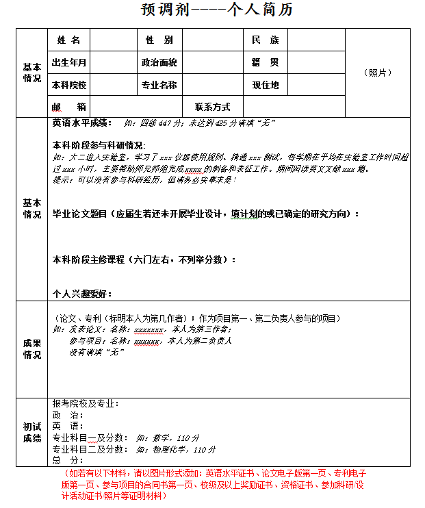 西南科技大学戴亚堂老师课题组招收调剂生(只接受化学、材料、物理相关专业,无法接受师范类考生)。 只接受邮件申请,名额有限请尽快! 研究方向:无机纳米材料、电化学超级电容器。详细简介见附图。 课题组有稳定的经费支持研究生的科研需求,且每个月按时给予学生一定的补贴。 请编写申请表,内容需包含:1.基本信息:姓名、照片、性别、出生年月、现居地、兴趣爱好、本科院校、本科专业名称、联系方式;2.科研情况:英语水平成绩、本科阶段参与科研/进入实验室工作情况、毕业论文题目(若未开展,请填写计划的研究方向)、本科阶段主修课程(6门左右,不列举分数);3.成果情况:列举论文、专利及参与的项目(需注明自己是第几作者/负责人);4.初试成绩:各个学科初试成绩(如:英语50分;数学,110分...) 也可以将下图简历模板保存并通过插入文本框做成图片形式保存为PDF(字体排版不限,我们更鼓励这种形式的申请表) 请将申请表发邮件至:swust511512@163.com 邮件标题统一为:姓名-初试分数-本科学校-本科专业。 通过初步筛选后我们会和你取得联系。 w81h3499773_1614067249_205.jpg w84h3499773_1614067353_539.png |