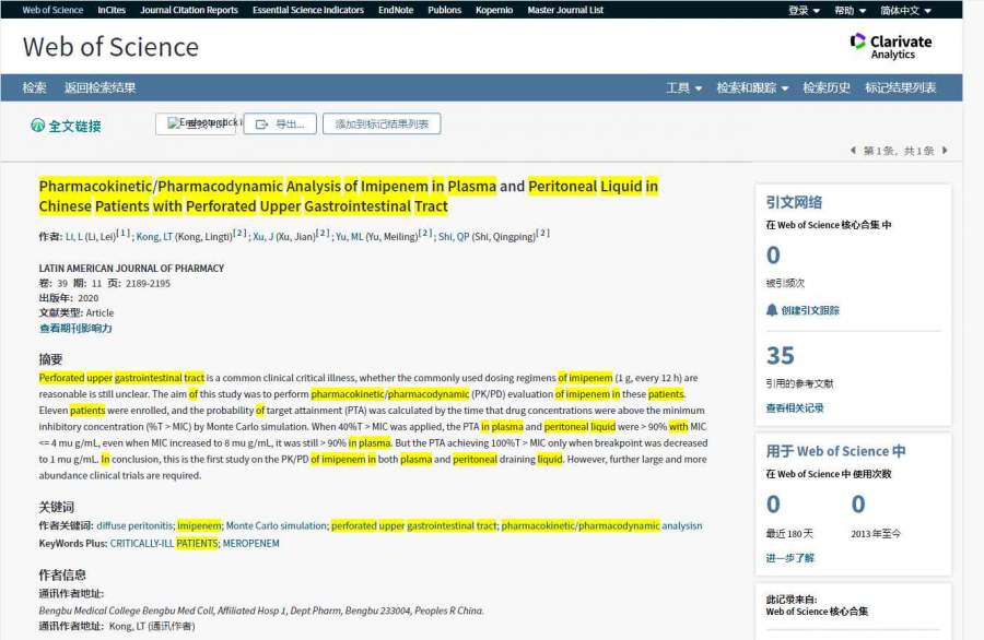 题目:Pharmacokinetic/Pharmacodynamic Analysis of Imipenem in Plasma and Peritoneal Liquid in Chinese Patients with Perforated Upper Gastrointestinal Tract 作者:LI L., KONG L., XU J., YU M. & SHI Q. |