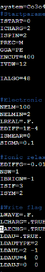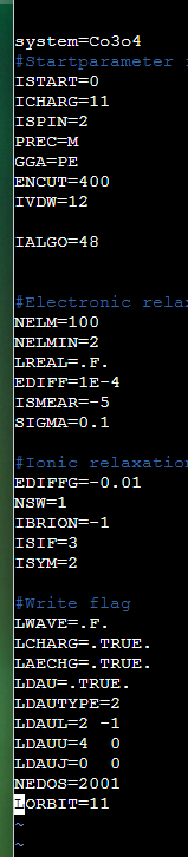 计算Co3O4的DOS和BAND图时带隙总是为0,但是上一步的静态计算得到的vasprun文件做出来的DOS图是有带隙的这是为什么?图1 是静态计算得到的DOS图,图2是计算DOS。图3是静态计算的INCAR,图4是DOS时INCAR 图1 图2 图3 图4 |
