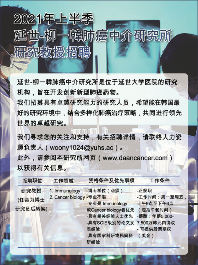 韩国延世大学肺癌研究所真诚招幕博士后/研究教授