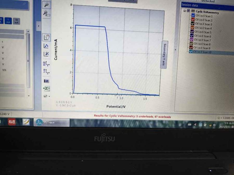 自己合成单体,然后0.002M的单体和0.1M TBAPF6/DCM 在100 mV/s扫描速率下循环伏安电解合成。工作电极是ITO玻璃,对电极是铂片,参比电极是Ag/AgCl。 首先一个问题,电解液是分层的,是不是我配溶液配错了?会影响电解合成吗? 第二个问题是为什么我的CV没有负电流?而且CV曲线没有闭合?如图所示 uderloads 和overloads 是什么意思? 小弟初涉电化学,很多不懂,希望赐教,感谢! 发自小木虫Android客户端 |