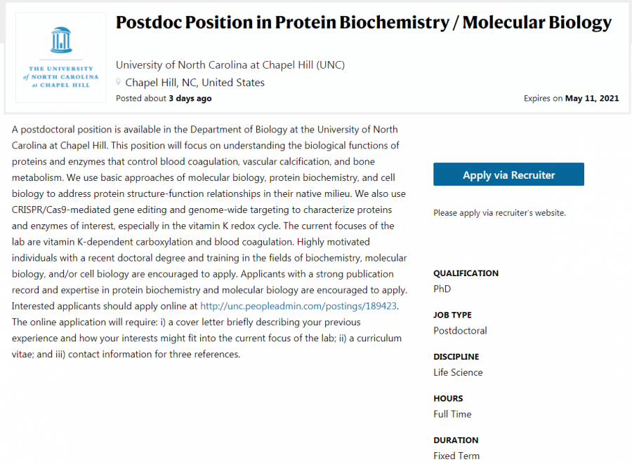 北卡罗莱纳大学教堂山分校-生物学博后招聘 A postdoctoral position is available in the Department of Biology at the University of North Carolina at Chapel Hill. This position will focus on understanding the biological functions of proteins and enzymes that control blood coagulation, vascular calcification, and bone metabolism. We use basic approaches of molecular biology, protein biochemistry, and cell biology to address protein structure-function relationships in their native milieu. We also use CRISPR/Cas9-mediated gene editing and genome-wide targeting to characterize proteins and enzymes of interest, especially in the vitamin K redox cycle. The current focuses of the lab are vitamin K-dependent carboxylation and blood coagulation. Highly motivated individuals with a recent doctoral degree and training in the fields of biochemistry, molecular biology, and/or cell biology are encouraged to apply. Applicants with a strong publication record and expertise in protein biochemistry and molecular biology are encouraged to apply. Interested applicants should apply online at https://unc.peopleadmin.com/postings/189423. The online application will require: i) a cover letter briefly describing your previous experience and how your interests might fit into the current focus of the lab; ii) a curriculum vitae; and iii) contact information for three references. 欢迎联系,详情请点击 https://unc.peopleadmin.com/postings/189423 微信图片_20210316103115.png |