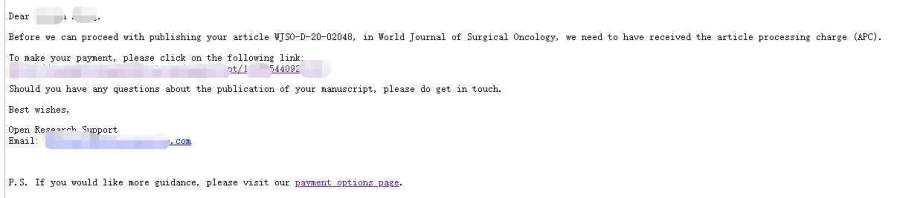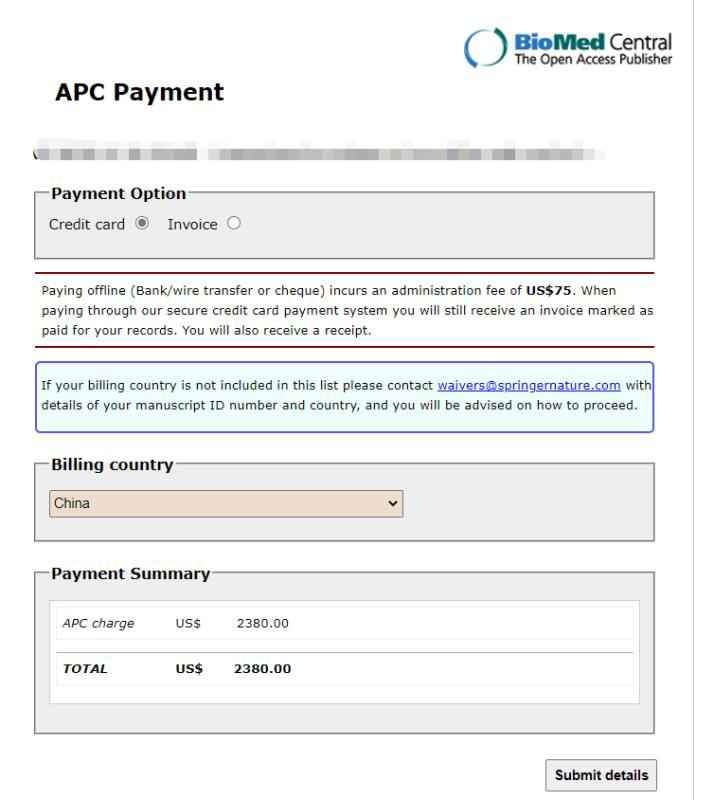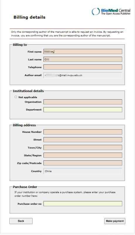 如图一,编辑发了交版面费的邮件,点击第一张图片的链接,到了图片二,提交后到图片三,现有如下问题,需要咨询大家: 1. 第三张图片中的第一栏billing to,默认的是我的信息(第一作者),名字可以更改,但邮箱是固定的,无法更改。不知道写成我的信息,对后面报销有没有影响。 2.第二栏institutional detail中,organization选项我理解的是学校名,department学院名。然而问题又来了,organization居然对字符长度有限制,我们学校的英文名太长了,剩几个字符无法写上去。不知道能不能简写。 针对以上两个问题,哪位大佬在bmc旗下期刊交版面费时,遇到过类似问题的,求解答,不胜感激! 发自小木虫Android客户端 |