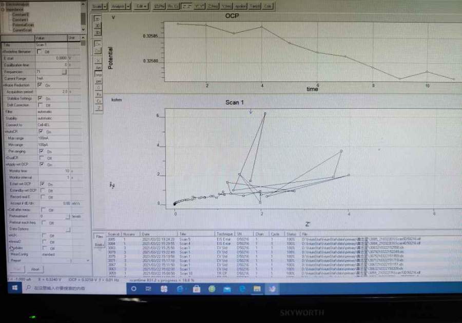 工作电极:碳布,对电极:铂片,参比电极:Ag/AgCl,电解液是1M硫酸钠。电化学工作站是IVIUMnSTAT,高频最大100000,低频到0.01。扫出来的曲线很奇怪,求解 发自小木虫Android客户端 |