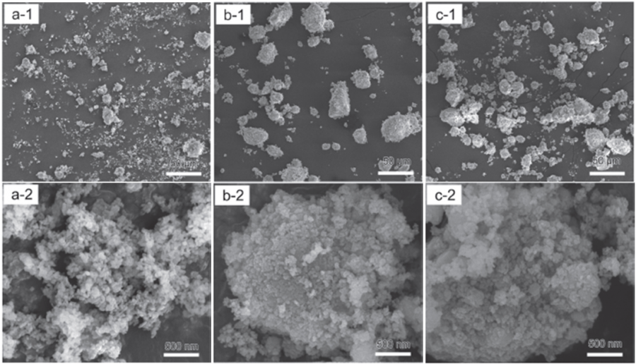 图1 活化的TiO2纳米颗粒的SEM图像(a-1,2)TiO2-0,(b-1,2)TiO2-2和(c-1,2)TiO2-4