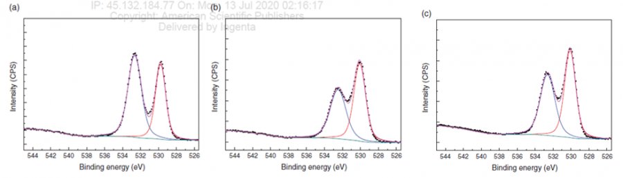 图5 活化的TiO2纳米颗粒的O 1s区域的XPS精细光谱:(a)TiO2-0,(b)TiO2-2和(c)TiO2-4