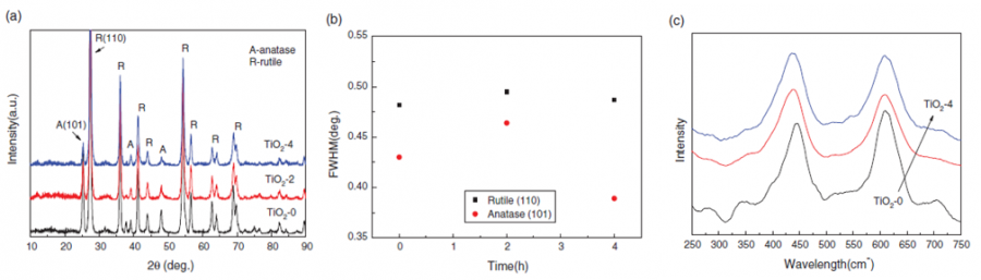 图2(a)TiO2纳米颗粒的XRD图谱(b)FWHM对DBDP研磨时间的依赖性(c)活化的TiO2纳米颗粒的拉曼光谱