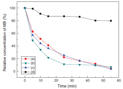 图6 活化的TiO2纳米粒子在紫外线照射下对亚甲基蓝的光催化降解:(a)TiO2-0,(b)TiO2-2和(c)TiO2-4,(d)不含TiO2纳米粒子